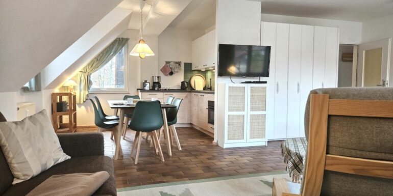 3 Zimmer-Maisonette ca. 75 qm für 2-6 Personen in der Residenz Kormoran. 1.OG: Wohnzimmer mit Schlafcouch, Sitzgarnitur, Kleiderschrank, SAT-TV/Radio, Duschbad/WC, Balkon, Essecke mit Küchenzeile, WLAN. 2.OG: 2 Schlafzimmer, Dusche/WC